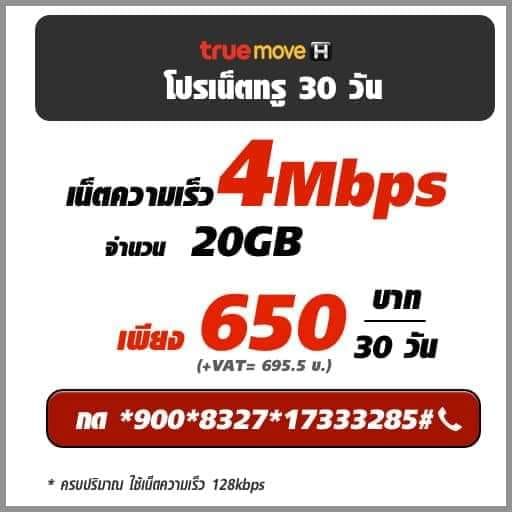 โปรเน็ต TRUE 4 Mbps 1 เดือน 30 วัน จำนวน 20GB ค่าบริการ เพียง 650 บาท ( รวมภาษี 695.5 บาท ) เน็ตใช้ตามปริมาณเมื่อใช้ครม เล่นต่อเนื่องที่ความเร็ว 128 Kbps สมัครกด *900*8327*17333285#โทรออก