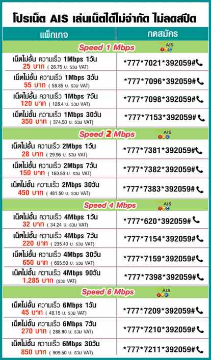 - โปรเน็ต AIS 45 บาท รายวัน ความเร็ว 6Mbps สมัครกด *777*7209*392059# 📞 - โปรเน็ต AIS 270 บาท รายสัปดาห์ ความเร็ว 6Mbps สมัครกด *777*7210*392059# 📞 - โปรเน็ต AIS 850 บาท รายเดือน ความเร็ว 6Mbps สมัครกด *777*7211*392059# 📞