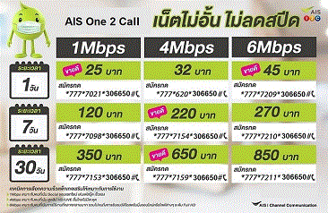เน็ต AIS One 2 Call รายวัน 25 บาท เน็ต 1 Mbps เน็ตไม่อั้น ไม่จำกัปริมาณ รวมภาษี=26.75 บาท สมัครกด *777*7021*306650# โทรออก