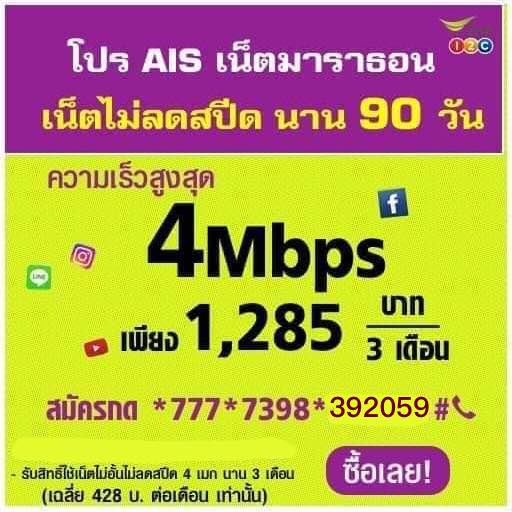 โปรเน็ต AIS 4 Mbps 3 เดือน 90 วัน 1,285 บาท ไม่อั้น ไม่ลดสปีด
