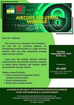 AirCUVE ยังวางแผนจัดงานสัมมนาออนไลน์ในหัวข้อ "Two Steps forward to security via AirCUVE 2FA" เพื่ออธิบายถึงความสำคัญของการยืนยันตัวตน ในฐานะที่เป็นโซลูชั่นรักษาความปลอดภัยทางไซเบอร์ที่ช่วยลดความเสี่ยงจากการถูกคุมคามในโลกไซเบอร์ลงได้ ทั้งนี้ งานสัมมนาดังกล่าวได้ถูกจัดขึ้นตั้งแต่วันที่ 15 กันยายนไปจนถึงวันที่ 20 ตุลาคม โดยจะแบ่งออกเป็น 6 เวทีสำหรับภาคอุตสาหกรรมหลัก ๆ อาทิ ภาคธุรกิจ, ธนาคาร, โรงเรียน, รัฐบาล และโรงพยาบาล