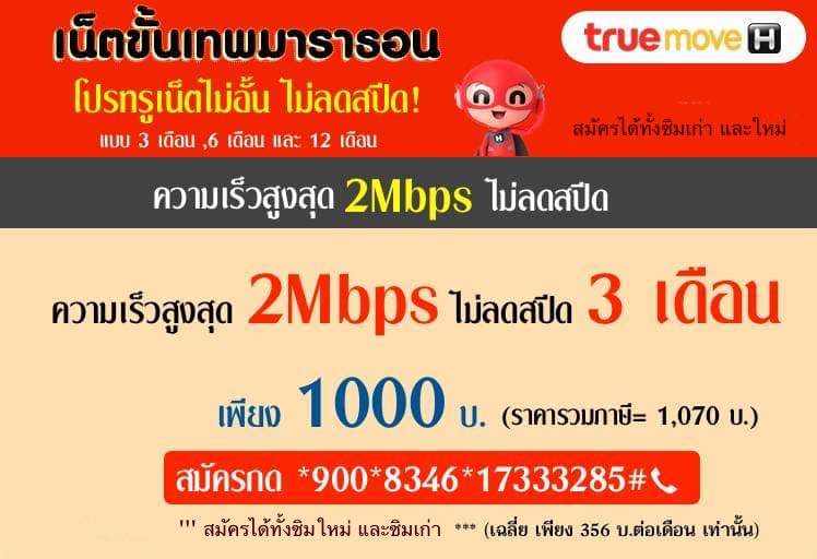 โปรเน็ต TRUE 2 Mbps 3 เดือน 90 วัน ไม่อั้น ไม่ลดสปีด นาน 3 เดือน ความเร็วสูงสุด 2 Mbps ค่าบริการ เพียง 1,000 บาท ( รวมภาษี 1,070 บาท ) สมัครกด*900*8346*17333285#โทรออก
