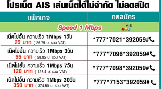 โปรเน็ต AIS วันทูคอล 1 Mbps 1 วัน 24 ชั่วโมง ไม่อั้น ไม่ลดสปีด ค่าบริการ เพียง 26.75 บาท ( รวมภาษีแล้ว ) สมัครกด *777*7021*392059#โทรออก