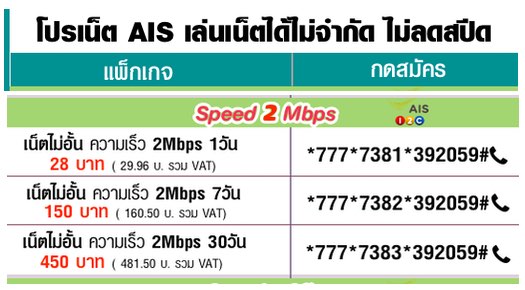โปรเน็ต AIS วันทูคอล 2 Mbps 1 วัน 24 ชั่วโมง ไม่อั้น ไม่ลดสปีด ความเร็วสูงสุด 2 Mbps ค่าบริการ เพียง 29.96 บาท ( รวมภาษีแล้ว ) สมัครกด *777*7381*392059#โทรออก