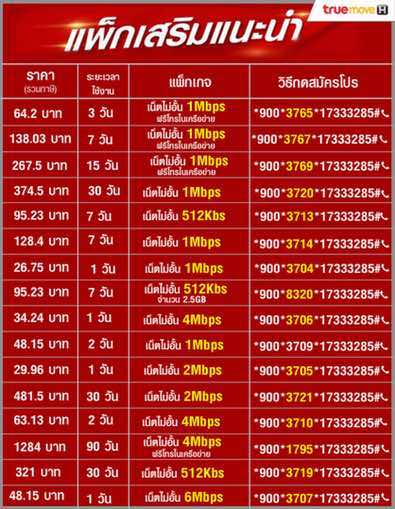 โปรเน็ต TRUE 1 Mbps 15 วัน เน็ตไม่อั้น ฟรีโทรในเครือข่าย ค่าบริการ เพียง 267.5 บาท ( รวมภาษีแล้ว ) สมัครกด *900*3769*17333285#โทรออก