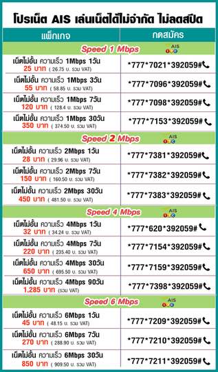 - โปรเน็ต AIS 450 บาท รายเดือน ความเร็ว 2Mbps สมัครกด *777*7383*392059# 📞 ======================== 💚 แพ็กเกจเน็ต AIS ความเร็ว 4Mbps เน็ตไม่ลดสปีดเล่นไม่จำกัด - โปรเน็ต AIS 32 บาท รายวัน ความเร็ว 4Mbps สมัครกด *777*620*392059# 📞
