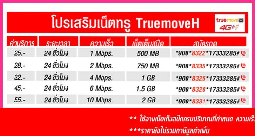 โปรเน็ต TRUE 1 Mbps 500 MB รายวัน 1 วัน 24 ชั่วโมง ค่าบริการ เพียง 25 บาท ( ยังไม่รวมภาษี 7 % ) เน็ตใช้ตามปริมาณ เมื่อใช้ครบกำหนด เล่นได้ต่อที่ความเร็ว 128Kbps สมัครกด *900*8322*17333285#โทรออก --------------------------------------------------------- โปรเน็ต TRUE 2 Mbps 750 MB รายวัน 1 วัน 24 ชั่วโมง ค่าบริการ เพียง 28 บาท ( ยังไม่รวมภาษี 7 % ) เน็ตใช้ตามปริมาณ เมื่อใช้ครบกำหนด เล่นได้ต่อที่ความเร็ว 128Kbps สมัครกด *900*8335*17333285#โทรออก --------------------------------------------------------- โปรเน็ต TRUE 4 Mbps 1 GB รายวัน 1 วัน 24 ชั่วโมง ค่าบริการ เพียง 32 บาท ( ยังไม่รวมภาษี 7 % ) เน็ตใช้ตามปริมาณ เมื่อใช้ครบกำหนด เล่นได้ต่อที่ความเร็ว 128Kbps สมัครกด *900*8325*17333285#โทรออก ---------------------------------------------------------- โปรเน็ต TRUE 6 Mbps 1.5 GB รายวัน 1 วัน 24 ชั่วโมง ค่าบริการ เพียง 45 บาท ( ยังไม่รวมภาษี 7 % ) เน็ตใช้ตามปริมาณ เมื่อใช้ครบกำหนด เล่นได้ต่อที่ความเร็ว 128Kbps สมัครกด *900*8328*17333285#โทรออก ----------------------------------------------------------- โปรเน็ต TRUE 10 Mbps 2 GB รายวัน 1 วัน 24 ชั่วโมง ค่าบริการ เพียง 55 บาท ( ยังไม่รวมภาษี 7 % ) เน็ตใช้ตามปริมาณ เมื่อใช้ครบกำหนด เล่นได้ต่อที่ความเร็ว 128Kbps สมัครกด *900*8331*17333285#โทรออก ---------------------------------------------------------- ...โปรเน็ตทรู 25 บาท. .เน็ตทรูรายวัน. .เน็ตทรู 25บาท 24 ชั่วโมง.