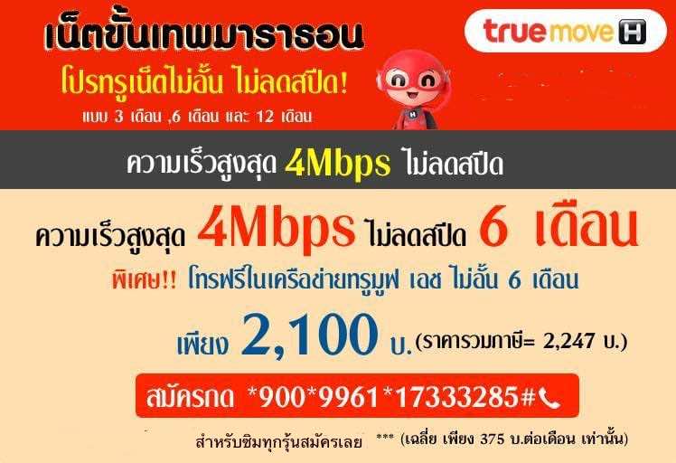 โปรเน็ต ทรูมูฟ 4 Mbps แบบ 6 เดือน เพียง 2,100 บาทไม่ลดสปีดโทรฟรีในเครีอข่าย ทรู