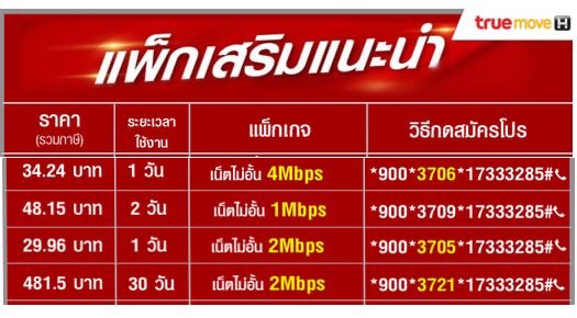โปรเน็ต TRUE 1 Mbps 2 Mbps 4 Mbps ราย 1 วัน 2 วัน 30 วัน ราคาค่าบริการ รวมภาษีแล้ว เล่นเน็ตไม่อั้น ไม่ลดสปีด --------------------------------------------------------- โปรเน็ต TRUE 4 Mbps 1 วัน 24 ชั้วโมง เล่นเน็ตไม่อั้น ไม่ลดสปีด ความเร็วสูงสุด 4 Mbps 1 วัน ค่าบริการ เพียง 34.24 บาท ( รวมภาษีแล้ว ) สมัครกด *900*3706*17333285#โทรออก ------------------------------------------------------- โปรเน็ต TRUE 1 Mbps 2 วัน 48 ชั่วโมง เล่นเน็ตไม่อั้น ไม่ลดสปีด ความเร็วสูงสุด 1 Mbps ค่าบริการ เพียง 48.15 บาท ( รวมภาษีแล้ว ) สมัครกด *900*3709*17333285#โทรออก ------------------------------------------------------ โปรเน็ต TRUE 2 Mbps 1 วัน 24 ชั่วโมง เล่นเน็ตไม่อั้น ไม่ลดสปีด ความเร็วสูงสุด 2 Mbps ค่าบริการ เพียง 29.96 บาท ( รวมภาษีแล้ว ) สมัครกด *900*3705*17333285#โทรออก ----------------------------------------------------- โปรเน็ต TRUE 2 Mbps 1 เดือ 30 วัน เล่นเน็ตไม่อั้น ไม่ลดสปีด ความเร็วสูงสุด 4 Mbps ค่าบริการ เพียง 481.5 บาท ( รวมภาษีแล้ว ) สมัครกด *900*3721*17333285#โทรออก ----------------------------------------------------- โปรเน็ต TRUE ทรูมูฟเอซ แบบเติมเงิน ค่าบริการรวมภาษีแล้ว เน็ตไม่อั้น ..โปรเน็ตทรู4Mbps1วัน,