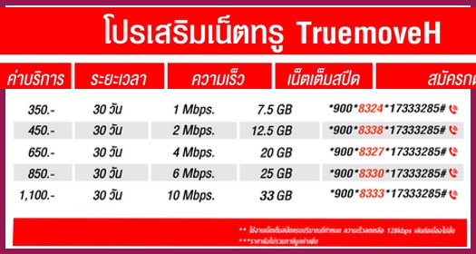 โปรเน็ต TRUE 10 Mbps 33 GB รายเดือน 1 เดือน 30 วัน ค่าบริการ เพียง 1,100 บาท ( ยังไม่รวมภาษี 7 % ) เน็ตใช้ตามปริมาณ เมื่อใช้ครบกำหนด เล่นได้ต่อที่ความเร็ว 128Kbps สมัครกด *900*8333*17333285#โทรออก