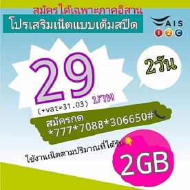 เน็ตเต็มสปีด AIS วันทูคอล 29 บาท รายวัน สมัครกด *777*7088*306650# โทรออก รายละเอียด ใช้งานเ เน็ตเต็มสปีด AIS วันทูคอล ปริมาณ 2 GB ใช้งานได้ภายใน 1 วัน ราคา 29 บาท รวมภาษี=31.03 บาท สมัครใช้งาน เฉพาะ ภาคอีสาน เท่านั้น