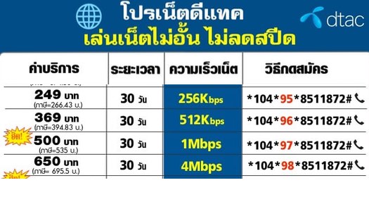 โปรเน็ต ดีแทค 4Mbps 1 เดือน 30 วัน ไม่อั้น ไม่ลดสปีด ความเร็วสูงสุด 4Mbps ค่าบริการ เพียง 650 บาท ( รวมภาษีแล้ว ) สมัคกด *104*98*8511872# โทรออก