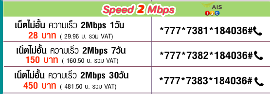 สมัครโปรเน็ต AIS 2Mbps 1 วัน 28 บาท สมัครโปรเน็ต AIS 2Mbps 7 วัน 150 บาท สมัครโปรเน็ต AIS 2Mbps 30 วัน 450 บาท