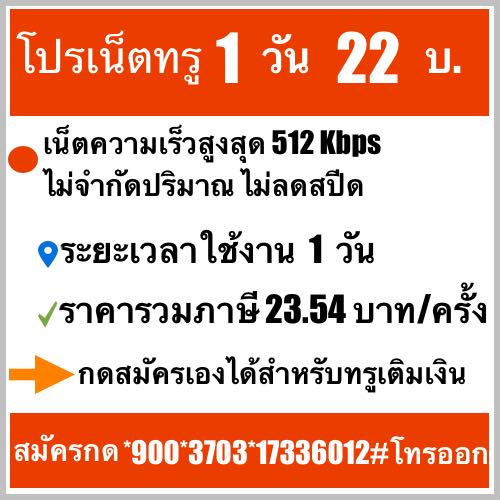โปรเน็ตทรู 1 วัน ไม่จำกัด โปรเน็ตทรู 1 วัน 22 บ./เร็ว 512kbps เน็ตเร็ว 512 kbps ไม่จำกัด ความเร็วคงที่ - ได้ใช้เน็ตความเร็วสูงสุด 512 kbps ไม่จำกัดปริมาณ ไม่ลดสปีด - ระยะเวลาใช้งาน 1 วัน ไม่ต่ออายุอัตโนมัติ - ราคารวมภาษี 23.54 บาท ต่อครั้ง สมัครเองได้สำหรับทรูเติมเงิน รหัสกดสมัคร *900*3703*17333202# โทรออก