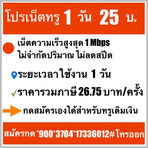 โปรเน็ตทรู 1 วัน ไม่จำกัด โปรเน็ตทรู 1 วัน 25 บ./เร็ว 1 Mbps เน็ตเร็ว 1 Mbps ไม่จำกัด ความเร็วคงที่ - ได้ใช้เน็ตความเร็วสูงสุด 1 Mbps ไม่จำกัดปริมาณ ไม่ลดสปีด - ระยะเวลาใช้งาน 1 วัน ไม่ต่ออายุอัตโนมัติ - ราคารวมภาษี 26.75 บาท ต่อครั้ง สมัครเองได้สำหรับทรูเติมเงิน รหัสกดสมัคร *900*3704*17333202# โทรออก