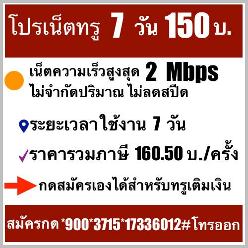 โปรเน็ตทรู 7 วัน ไม่จำกัด โปรเน็ตทรู 7 วัน 150 บ./เร็ว 2 Mbps เน็ตเร็ว 2 Mbps ไม่จำกัดปริมาณ ไม่ลดสปีด