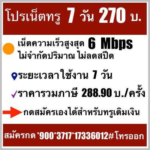 โปรเน็ตทรู 7 วัน ไม่จำกัด โปรเน็ตทรู 7 วัน 270 บ./เร็ว 6 Mbps เน็ตเร็ว 6 Mbps ไม่จำกัดปริมาณ ไม่ลดสปีด