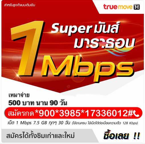 โปรเน็ตทรูเหมาจ่าย 90 วัน เพียง 500 บาท เท่านั้น! เน็ตทรูเหมาจ่าย 90 วัน 500 บาท เน็ต 7.5 GB ความเร็ว 1 Mbps รายละเอียด: - ได้รับเน็ตปริมาณ 7.5GB เร็ว 1 Mbps ทุกๆ 30 วัน เมื่อครบปริมาณเน็ต เล่นได้ต่อเนื่องความเร็ว 128 Kbps - ระยะเวลาใช้งาน 90 วัน - ค่าสมัคร 500 บาท(รวมภาษีแล้ว) สมัครได้ทั้งซิมเก่าและซิมใหม่ รหัสกดสมัคร*900*3985*17336012#โทรออก