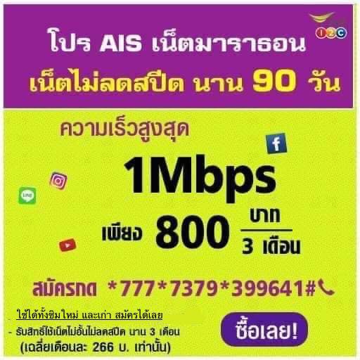 -โปรเน็ต ais วันทูคอล 1Mbps 3 เดือน 90 วัน 800 บาท ไม่อั้น ไม่ลดสปีด