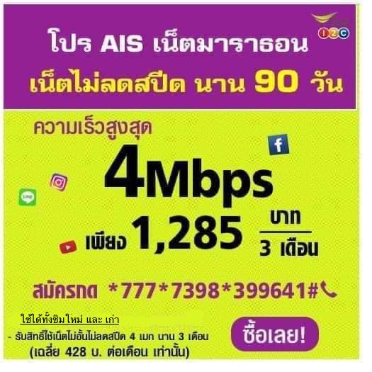 -โปรเน็ต ais วันทูคอล 4Mbps แบบ 3 เดือน 90 วัน เน็ตไม่อั้น ไม่ลดสปีด ความเร็วสูงสุด 4 Mbps .สมัครได้ทั้งซิมใหม่และเก่า ค่าบริการ เพียง 1,285 บาท ( รวมภาษีแล้ว ) สมัครกด *777*ึ7398*399641# โทรออก