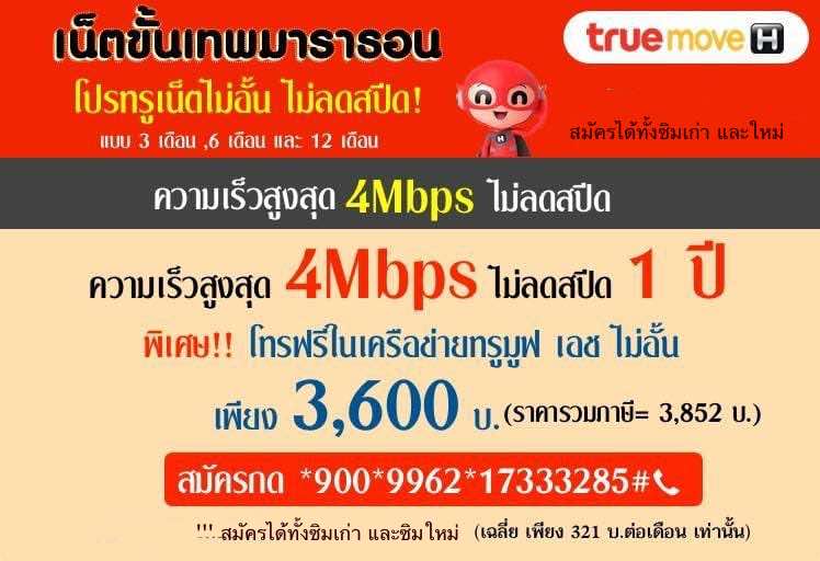 โปรเน็ต TRUE 4 Mbps 12 เดือน 1 ปี เน็ตไม่อั้น ไม่ลดสปีด ความเร็วสูงสุด 4 Mbps ค่าบิการ เพียง 3,600 บาท ( รวมภาษี 3,852 บาท) สมัครกด *900*9962*17333285#โทรออก ใช้ได้ทั้ง ซิมเก่า และซิมใหม่ สมัครเลย