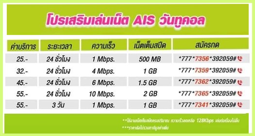 โปรเน็ต เอไอเอส วันทูคอล 1 Mbps 500MB 1 วัน 24 ชั่วโมง ค่าบริการ เพียง 25 บาท ( ยังไม่รวมภาษี 7% ) เน็ตใช้ตามปริมาณ เมื่อใช้ครบกำหนด เล่นได้ต่อเนื่องที่ควาเร็ว 128Kbps สมัครกด *777*7356*392059#โทรออก
