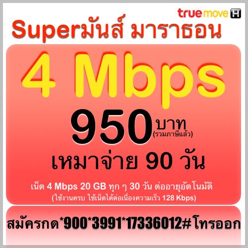 โปรเน็ตทรู มาราธอน 3 เดือน 4 Mbps 20 GB เหมาจ่าย เพียง 950 บาท รายละเอียด: - ได้ใช้เน็ต 4 Mbps 20 GB ทุกๆ 30 วัน เมื่อใช้ครบปริมาณเน็ตความเร็วจะเล่นได้ต่อเนื่อง 128Kbps - ระยะเวลาใช้งาน 90 วัน (ต่ออายุอัตโนมัติทุก 30 วัน) - ราคารวมภาษี 950 บาท - สมัครได้ทั้งซิมเก่าและซิมใหม่ รหัสกดสมัคร*900*3991*17336012#โทรออก  ดูโปรเน็ตทรูเพิ่มเติม https://nettrue19baht1day.blogspot.com/2021/01/90-950.html
