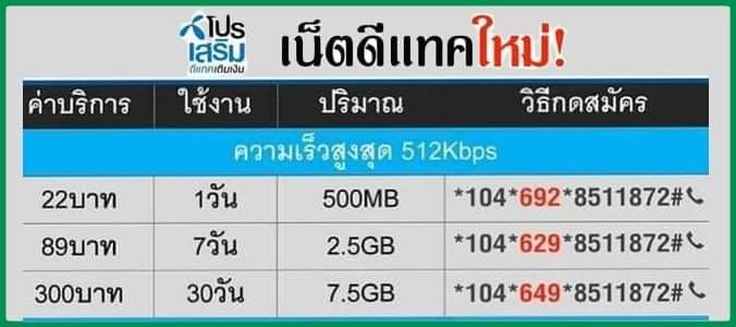 โปรเน็ต ดีแทค 512 Kbps รายเดือน 1เดือน 30 วัน ค่าบริการ เพียง 300 บาท 7.5GB ยังไม่รวมภาษีมูลค่าเพิ่ม 7% เน็ตใช้ตามปริมาณที่กำหนด เมื่อครบเล่นต่อเนื่องที่ความเร็ว 128 Knps สมัครกด *104*649*8511872#โทรออก