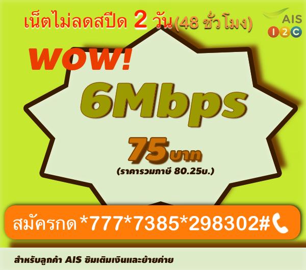 โปรเน็ต AIS เหมา เหมา 2 วัน 75 บาท 6 Mbps ไม่อั้น - รับสิทธิ์ใช้เน็ต AIS เหมา เหมา 6 Mbps ไม่จำกัดปริมาณ - ระยะเวลาใช้งาน 2 วัน(48 ชม.) - ราคารวมภาษี 80.25 บาท