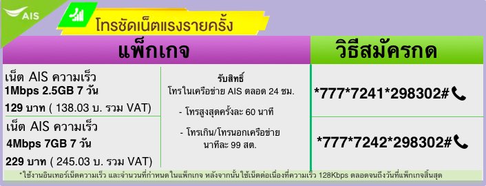 หมายเหตุ : - เมื่อใช้งานอินเทอร์เน็ตความเร็ว และจำนวนที่กำหนดในแพ็กเกจ หลังจากนั้น ใช้เน็ตได้ต่อเนื่องที่ความเร็ว 128Kbps ตลอดจนถึงวันที่แพ็กเกจสิ้นสุด - โทรฟรีในเครือข่าย AIS ครั้งละ 60 นาที โทรเกินคิดนาทีละ 99 สต.