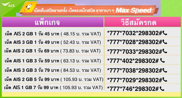 เน็ต เอไอเอส Max Speed , เน็ตรายวัน, 45 บาท/วัน เน็ต AIS เต็มสปีด 2 GB 1 วัน 45 บาท(+vat=48.15บ.) สมัครกด*777*7032*298302#โทรออก . เน็ต เอไอเอส Max Speed, เน็ตรายวัน ,49 บาท/วัน เน็ต AIS เต็มสปีด 3 GB 1 วัน 49 บาท(+vat=52.43บ.) สมัครกด*777*7028*298302#โทรออก . เน็ต เอไอเอส Max Speed ,เน็ตรายวัน , 69 บาท/วัน เน็ต AIS เต็มสปีด 2 GB 1 วัน 69 บาท(+vat=73.83บ.) สมัครกด*777*7033*298302#โทรออก . เน็ต เอไอเอส Max Speed , เน็ต 3 วัน , 59 บาท เน็ต AIS เต็มสปีด 1 GB 3 วัน 59 บาท(+vat=63.13บ.) สมัครกด*777*402*298302#โทรออก . เน็ต เอไอเอส Max Speed , เน็ต 3 วัน , 79 บาท เน็ต AIS เต็มสปีด 3 GB 3 วัน 79 บาท(+vat=84.53บ.) สมัครกด*777*7038*298302#โทรออก . เน็ต เอไอเอส Max Speed ,เน็ต 5 วัน , 99 บาท เน็ต AIS เต็มสปีด 2 GB 5 วัน 99 บาท(+vat=105.93บ.) สมัครกด*777*7029*298302#โทรออก . เน็ต เอไอเอส Max Speed , 7 วัน , 99 บาท เน็ต AIS เต็มสปีด 1 GB 7 วัน 99 บาท(+vat=105.93บ.) สมัครกด*777*746*298302#โทรออก