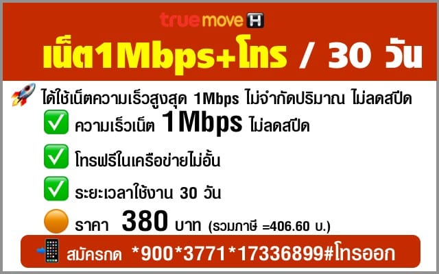โปรเน็ต TRUE 1 Mbps 30 วัน โทรฟรีในเครือข่าย ไม่อั้น ไม่ลดสปีด ค่าบริการ เพียง 380 บาท (รามภาษี 406.60 บาท) สมัครกด *900*3771*17336899# โทรออ