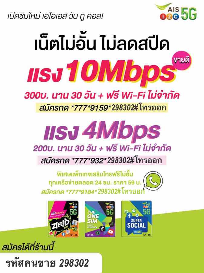 เน็ต AIS 30 วัน 300 บาท ความเร็วสุงสุด 10 Mbps ไม่อั้น ไม่ลดสปีด + ฟรี WiFi ไม่จำกัด สมัครกด*777*9159*298302#โทรออก