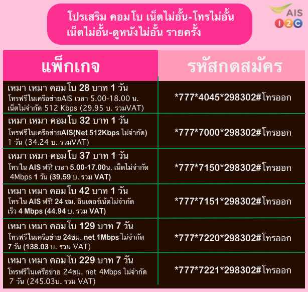 เน็ต AIS เหมา เหมา คอมโบ 42 บาท 1 วัน โทรในเครือข่าย AIS ฟรี! 24ชม. อินเตอร์เน็ตไม่จำกัด เร็ว 4 Mbps (ราคารวมภาษี 44.94 บาท) สมัครกด*777*7151*298302#โทรออก
