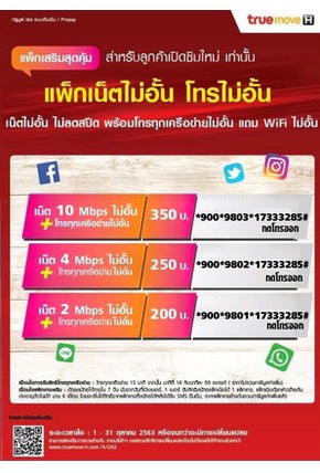 ไม่อั้น ไม่ลดสปีด 2Mbps ,4 Mbps ,10 Mbps โทรฟรีทุกเครือข่ายครั่งละ 15 นาที 24 ชั่วโมง ถ้าโทรเกิน 15 นาทีๆ ละ 99 ส.ต .------------------------------------------------ โปรเน็ต TRUE 10 Mbps 350 บาท 30 วัน โทรฟรีทุกเครือข่ายครั้งละ 15 นาที 24 ชั่วโมง ไม่อั้น ไม่ลดสปีด ความเร็วสูงสุด 10Mbps สำหรับซิมใหม่ที่เปิดใช้ไม่เกิน 7 วัน สมัครเลย ค่าบริการ เพียง 350 บาท ( รวมภาษีแล้ว ) ต่ออายุอัตโนมัติทุก 30 วันนาน 6 เดือน สมัครกด *900*9803*17333285# โทรออก ---------------------------------------------------- . โปรเน็ต TRUE 4 Mbps 250 บาท 30 วัน โทรฟรีทุกเครือข่ายครั่งละ 15 นาที 24 ชั่วโมง ไม่อั้นไม่ลดสปีด ความเร็วสูงสุด 4 Mbps สำหรับซิมใหม่ที่เปิดใช้ไม่เกิน 7 วัน สมัครเลย ค่าบริการ เพียง 250 บาท ( รวมภาษีแล้ว ) ต่ออายุอัตโนมัติทุก 30 วันนาน 6 เดือน สมัครกด *900*9802*17333285# โทรออก ----------------------------------------------------. โปรเน็ต TRUE 2Mbps 200 บาท 30 วัน ไทรฟรีทุกเครือข่ายครั้งละ 15 นาที 24 ชั่วโมง ไม่อั้น ไม่ลดสปีด ความเร็วสูงสุด 2 Mbps สำหรับซิมใหมที่เปิดใช้ไม่เกิน 7 วัน สมัครเลย ค่าบริการ เพียง 200 บาท ( รวมภาษีแล้ว ) ต่ออายุอัตโนมัติทุก 30 วัน นาน6 เดือน สมัครกด *900*9801*17333285# โทรออก ---------------------------------------------------- ..โปรเน็ตทรูสำหรับซิมใหม่, ..เน็ตไม่อั้น ไม่ลดสปีด