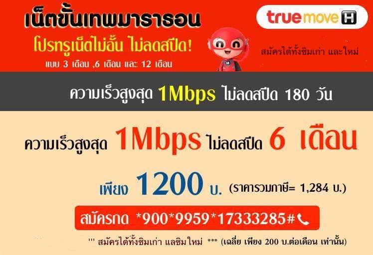 โปรเน็ต TRUE 1 Mbps 6 เดือน 180 วัน เน็ตไม่อั้น ไม่ลดสปีด ความเร็วสูงสุด 1 Mbps ค่าบิการ เพียง 1,200 บาท ( รวมภาษี 1,284 บาท) สมัครกด *900*9959*17333285#โทรออก ใช้ได้ทั้ง ซิมเก่า และซิมใหม่ สมัครเลย