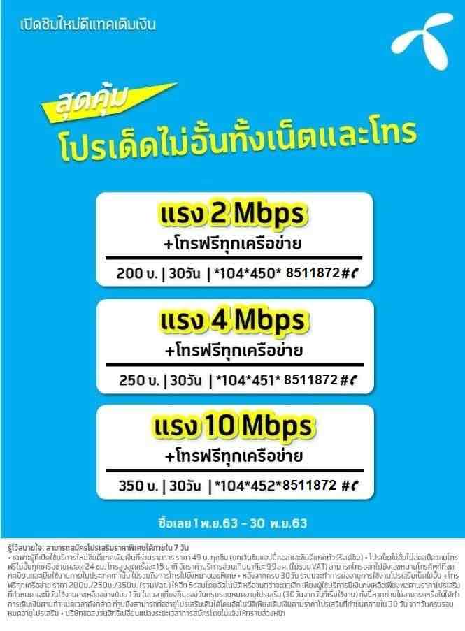 โปรเน็ต ดีแทค 4 Mbps สำหรับซิมใหม่ 1 เดือน 30 วัน ต่ออายุ อัตโนมัติทุก 30 วันนาน 6 เดือน ๆ 250 บาท โทรฟรีทุกเครือข่าย 30 วัน เล่นเน็ตไม่อั้น ไม่ลดสปี ความเร็วสูงสุด 4 Mbps ค่าบริการ เพียง250 บาท ( รวมภาษีแล้ว ) สมัคกด *104*451*8511872# โทรออก ==========================