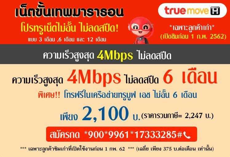 โปรเน็ตTRUE 4Mbps 6 เดือนเพียง 2,100 บาทโทรฟรีในเครือข่ายเน็ตไม่อั้น ไม่ลดสปีด
