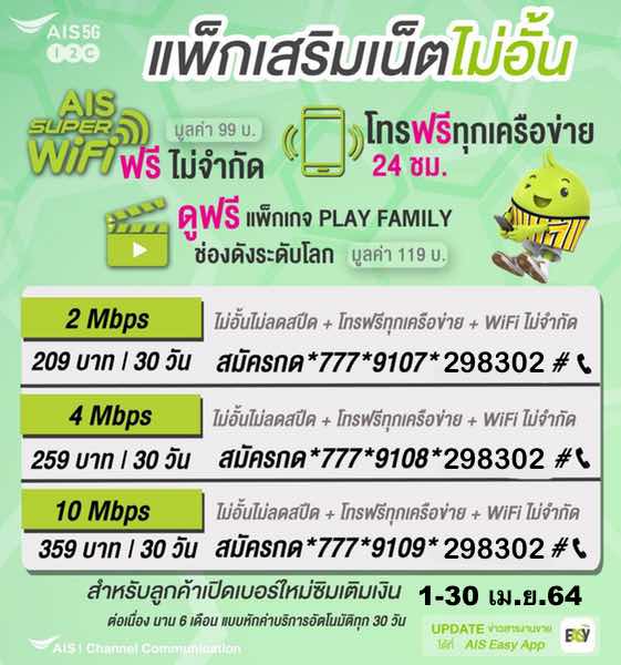 โปรเน็ต AIS รายเดือน ไม่อั้นไม่ลดสปีด เร็ว 2 Mbps + โทรฟรีทุกเครือข่าย +WiFi ไม่จำกัด 209 บาท สม้ครกด*777*9107*298302#โทรออก