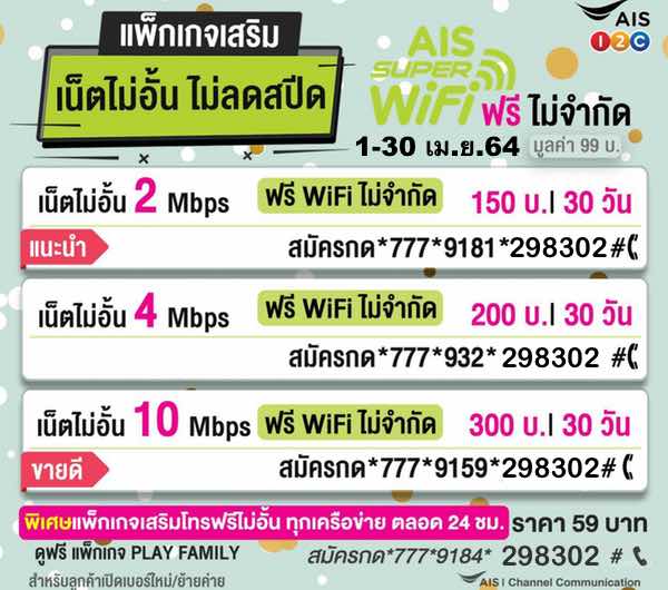 โปรเน็ต AIS รายเดือน ไม่อั้น ไม่ลดสปีด 2 Mbps + ฟรีWiFi ไม่จำกัด 150 บาท สมัครกด*777*9181*298302#โทรออก