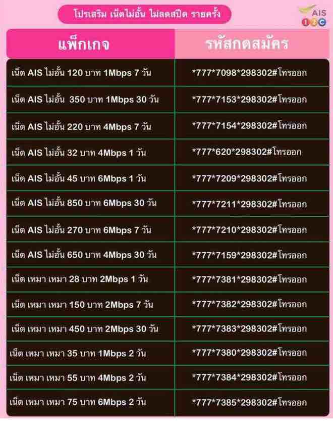 โปรเน็ต AIS 7 วัน 1 Mbps 120 บาท ไม่ลดสปีด - รับสิทธิ์ใช้งานเน็ต AIS 1 Mbps ไม่อั้นไม่ลดสปีด - ระยะเวลาใช้งาน 7 วัน - ราคารวมภาษี 128.40 บ./ครั้ง สมัครกด*777*7098*298302#โทรออก โปรเน็ต AIS 30 วัน 1 Mbps 350 บาท ไม่ลดสปีด - รับสิทธิ์ใช้งานเน็ต AIS 1 Mbps ไม่อั้นไม่ลดสปีด - ระยะเวลาใช้งาน 30 วัน - ราคารวมภาษี 374.50 บ./ครั้ง สมัครกด*777*7153*298302#โทรออก