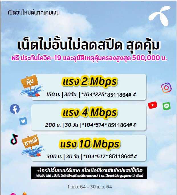 เน็ต datc รายเดือน ไม่อั้น ไม่ลดสปีด 2 Mbps + โทรฟรีเบอร์ดีแทคไม่อั้น 150 บาท สมัครกด*104*225*8511864#โทรออก