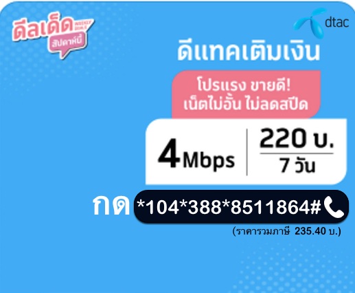 เน็ต dtac 220 บาท ไม่อั้น ไม่ลดสปีด เร็ว 4 Mbps 7 วัน