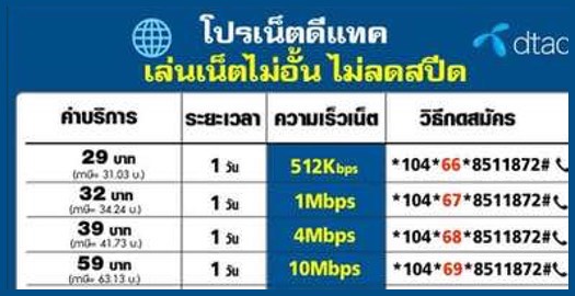 โปรเน็ค DTAC ดีแทค 1Mbps 4 Mbps 10 Mbps1วัน 24ชั่วโมงไม่อั้นไม่ลดสปีด