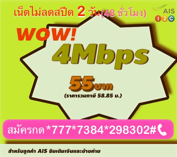 เน็ต AIS เหมา เหมา 2 วัน 55 บาท 4 Mbps เล่นเน็ตได้ไม่อั้น - รับสิทธิ์ใช้เน็ต AIS 4 Mbps ไม่ลดสปีด - ระยะเวลาใช้งาน 2 วัน(48 ชม.) - ราคารวมภาษี 58.85 บาท สมัครกด*777*7384*298302#โทรออก