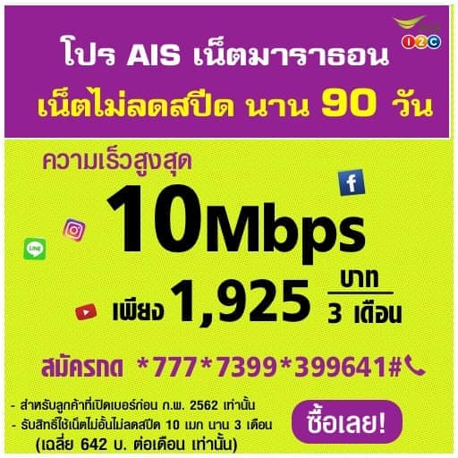..เน็ตAISวันทูคอล 10 Mbps 1,925 บาท 3เดือน 90วัน เน็ตไม่อั้นไม่ลดสปีด