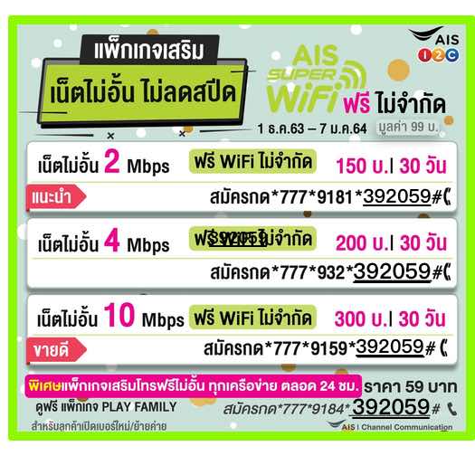 โปรเน็ต AIS 4 Mbps 200 บาท สำหรับซิมใหม่ ไม่อัน ไม่ลดสปีด ใช้งานได้ 30 วัน เน็ตความเร็วสูงสุด 2Mbps 4Mbps 10 Mbps ฟรี WiFi ไม่อั้น สำหรับซิมใหม่ ที่เปิดใช้ไม่เกิน 7 วัน สมัครเลย ===========================