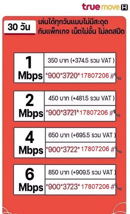 โปรเน็ตทรูมูฟเอช เน็ตไม่อั้น 2mbps 4mbps 1mbps 6mbps ใช้งานเป็นเดือนๆ หรือ 30วัน เป็นเน็ตทรูมูฟเอชระบบเติมเงิน เน็ตทรูมูฟเอช 450บาท / เดือน เน็ตไม่อั้น 2mbps สมัครกด *900*3721*17807206# โทรออก - เน็ตไม่อั้น ทรูมูฟเอช ความเร็วสูงสุด 2mbps - ระยะเวลาการใช้งาน 1 เดือน หรือ 30 วัน - ราคา 450 บาท รวมภาษี=481.5 บาท