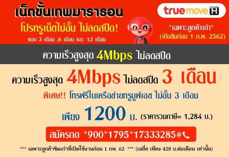 โปรเน็ต TRUE 4Mbps 3เดือน 90วัน+โทรฟรีในเครือข่าย ไม่อั้นไม่ลดสปีด เน็ตไม่อั้น ไม่ลดสปีด ความเร็วสูงสุด 4 Mbps พิเศษ !!โทรฟรีในเครือข่ายทรูมูฟ เอซ ไม่อั้น 3 เดือน ค่าบิการ เพียง 1,200 บาท ( รวมภาษี 1,284 บาท) สมัครกด *900*1795*17333285#โทรออก