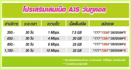 โปรเน็ต เอไอเอส วันทูคอล 10 Mbps 33GB 1 เดือน 30 วัน